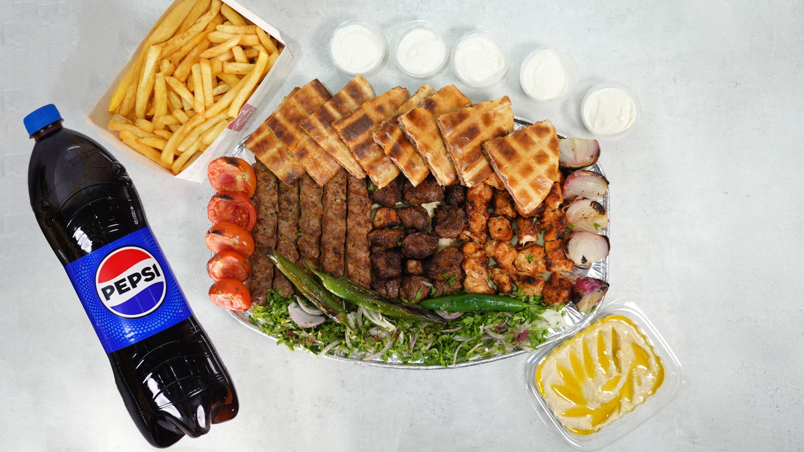 A hearty grilled assortment featuring three tikka skewers, four shish tawook skewers, five kebabs, and eight pieces of arayes. Served with hummus, French fries, garlic sauce, pickles, fresh bread, and one 1.25-liter bottle of Pepsi.